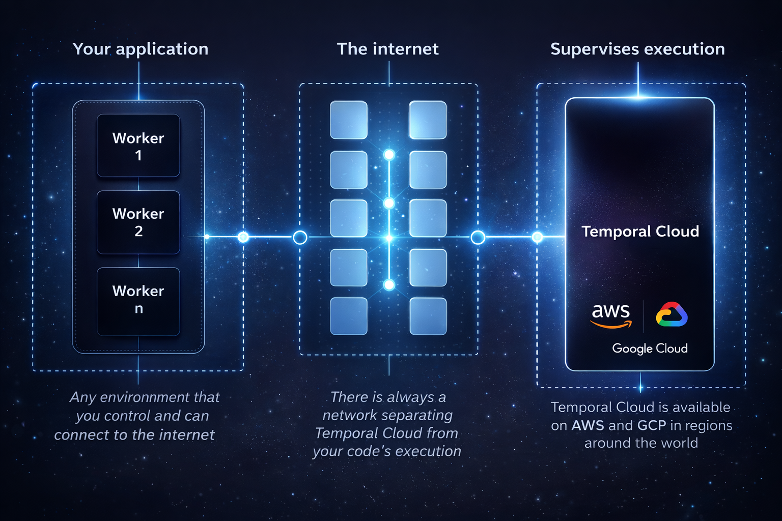 Temporal Cloud never executes your application code. Workers run in your environment, connecting to Temporal Cloud over encrypted channels. You control access to your compute resources and secrets.